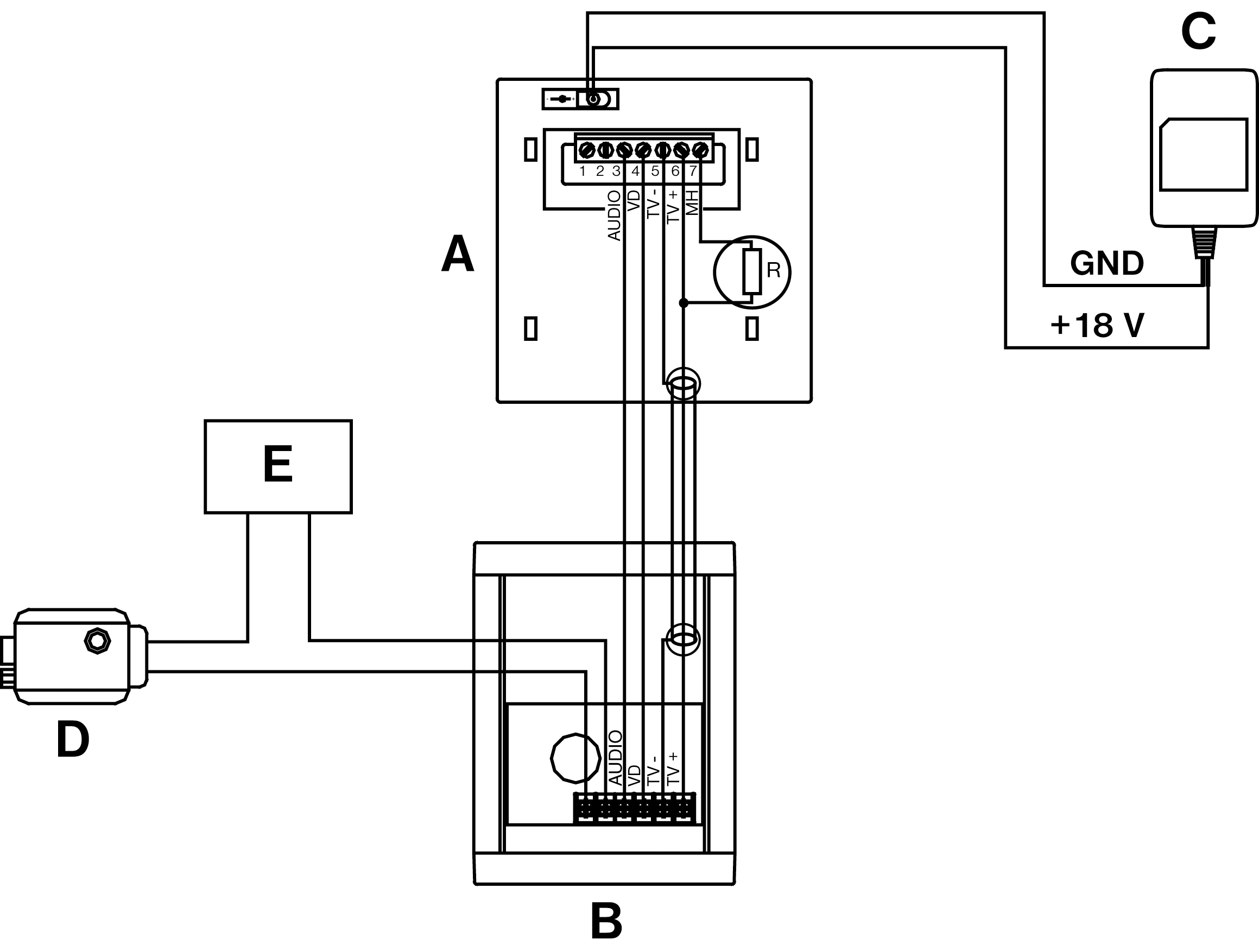 A- monitor, B- kamera, C- adaptér, D- elektrický zámek dveří (není součástí sestavy), E- zdroj pro el. zámek (není součástí sestavy).