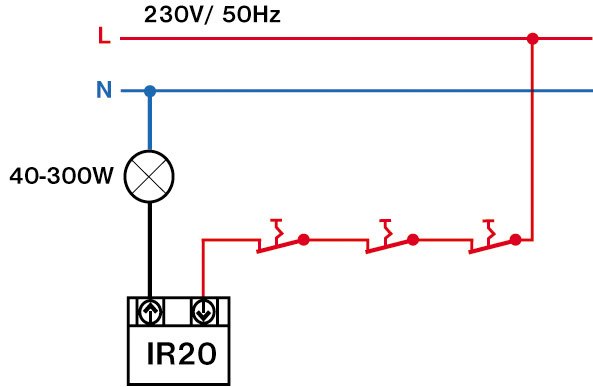 Dvouvodičové zapojení umožňuje přímou náhradu obyčejného tlačítka za IR20.