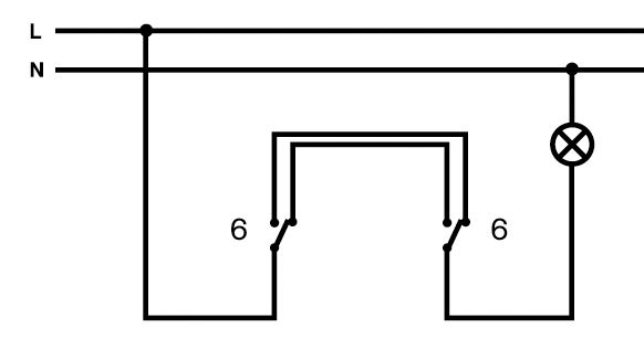 Při použití dvou střídavých přepínačů v jednom okruhu, je možné ovládat jedno svítidlo ze dvou míst (např.začátek a konec chodby).