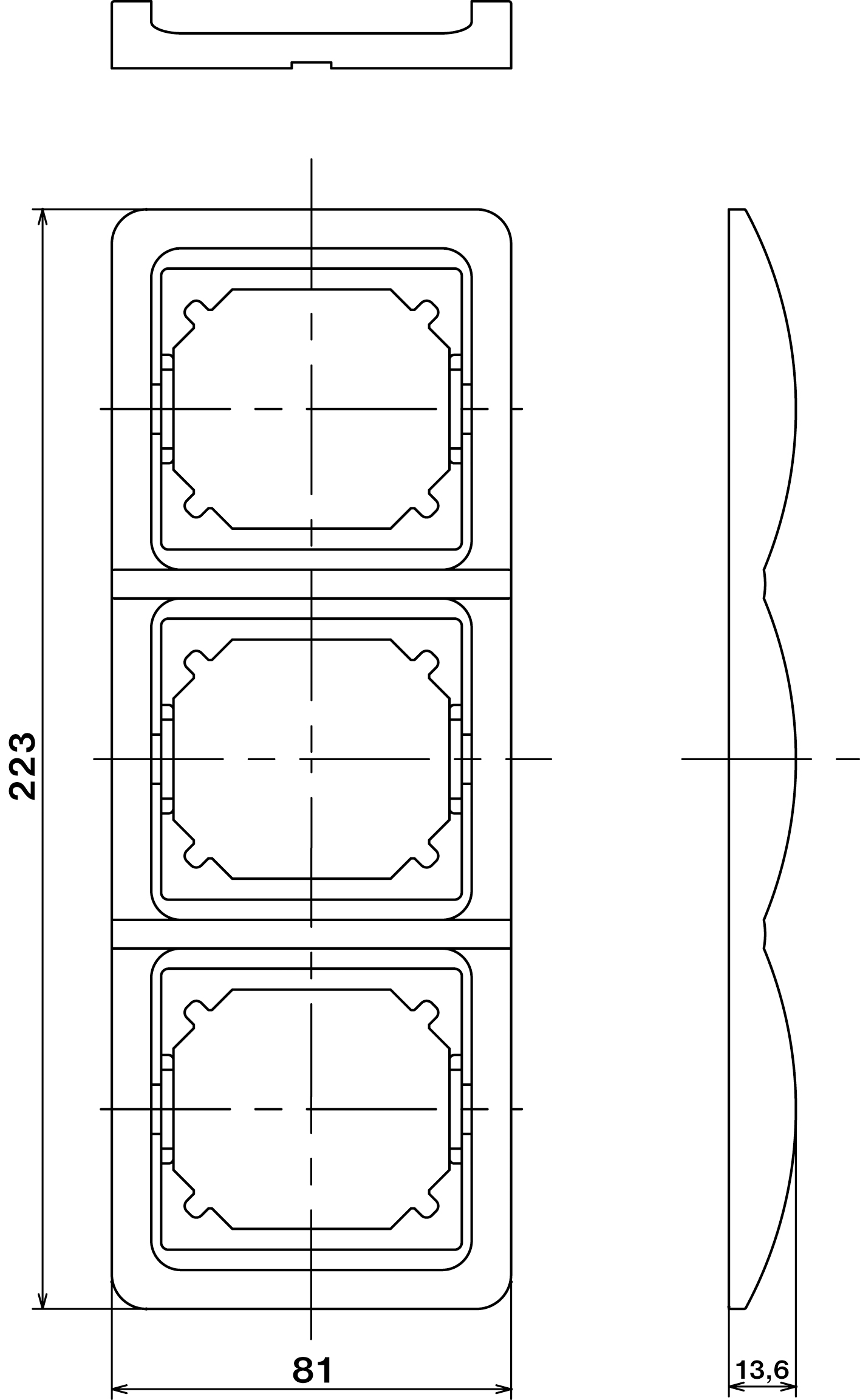 Trojnásobný vnější rámeček pro uložení tří přístrojů pod sebe do vícenásobné inst.krabice.