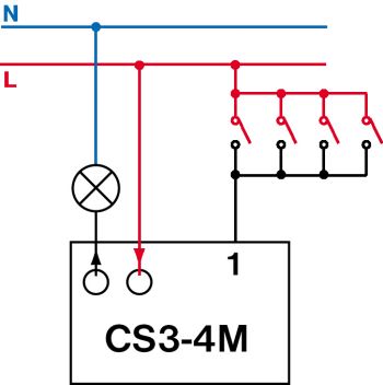 Spínač pod vypínač CS3-4M je v zapojení BEZ NULOVÉHO VODIČA a má možnosť nastavení ÔSMICH FUNKCIÍ ZOPNUTIA.